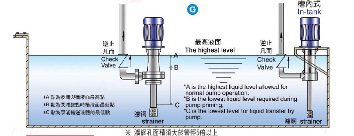 9、出口配管高度如有高過馬達(dá)以上或有逆壓之情形時(shí),請?jiān)诒闷殖隹谔幯b置逆止閥,裝置位置請勿超過最高液面線太多。